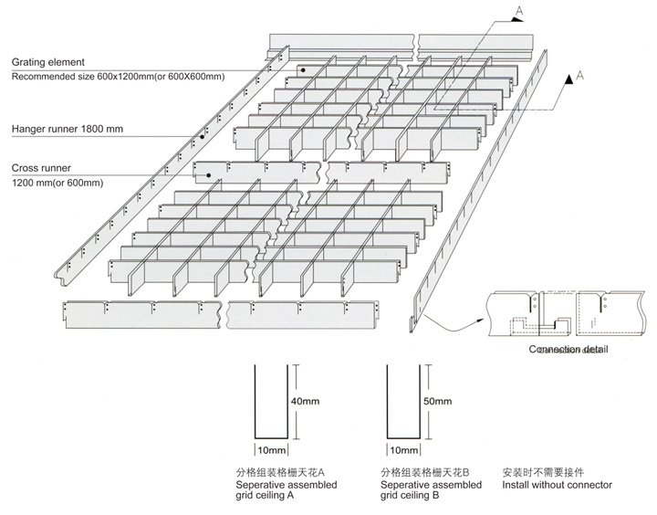 格柵天花的特色與優點:材質輕巧、外觀簡潔、立體感強、造型新穎、防火防潮、拆裝方便、通風好,且燈具、冷氣口、排氣口等可裝在天花內,可局部使用,也可以連續使用。