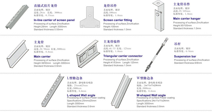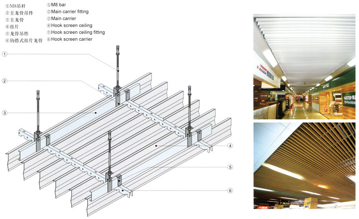 這是一種裝飾性天幕型吊頂,可調節房屋視覺高度,并可隱藏樓頂的所有管道和其他設施,同時還可以使進入房間的日光或燈光柔和均勻。掛片天花由鋁合金及龍骨組成,裝拆靈活。直插式有75mm、85mm、110mm,以110mm、150mm間距固定于龍骨上,掛片天花絕不影響房屋的吸音以及消費噴淋、空調系列等設施的安裝,備有多種顏色可供選擇。該產品適用于建材裝飾、機場、地鐵站等大型場所。